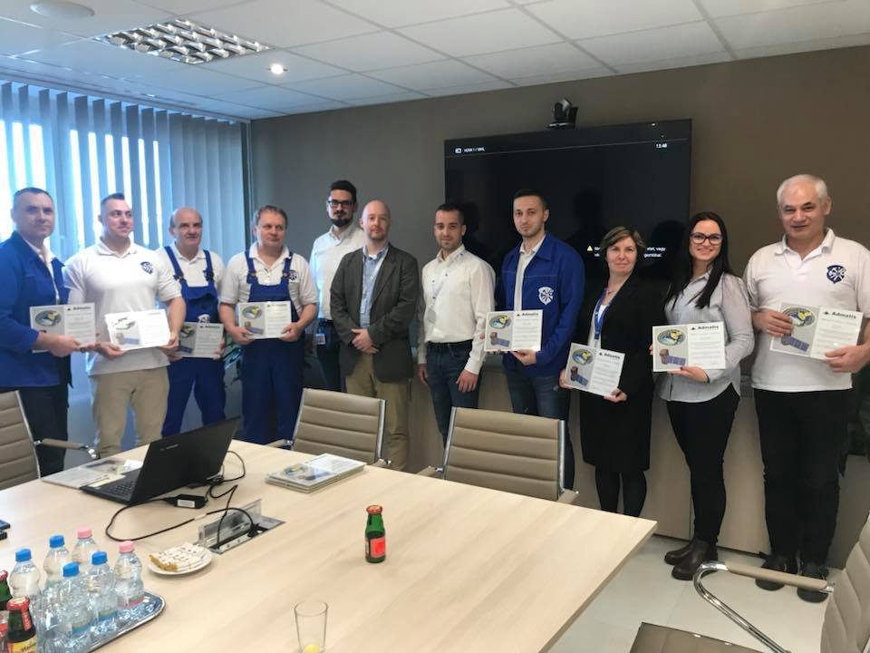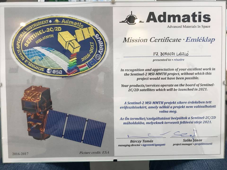 Bárczy Tamás az Admatis Kft. ügyvezető igazgatója és Szőke János projektvezető emléklappal köszönte meg a Borsodi Műhely Kft. azon munkatársaknak a munkáját, akik a Sentinel – 2 MSI MMTH projekt sikere érdekében közreműködtek és ezen termékek fellövésre kerültek a 2C/2D műholdakba.